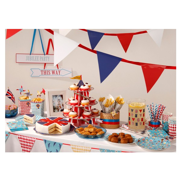3 tier helter skelter village fete card cake stand with 10 flag stickers to personalise the occasion. To complete the look, dress your cakes in matching cake cases and card toppers. 1 x disposable card cake stand with 2 tiers in 2 reversible designs and 10 flag stickers. Holds up to 12 medium sized cupcakes.